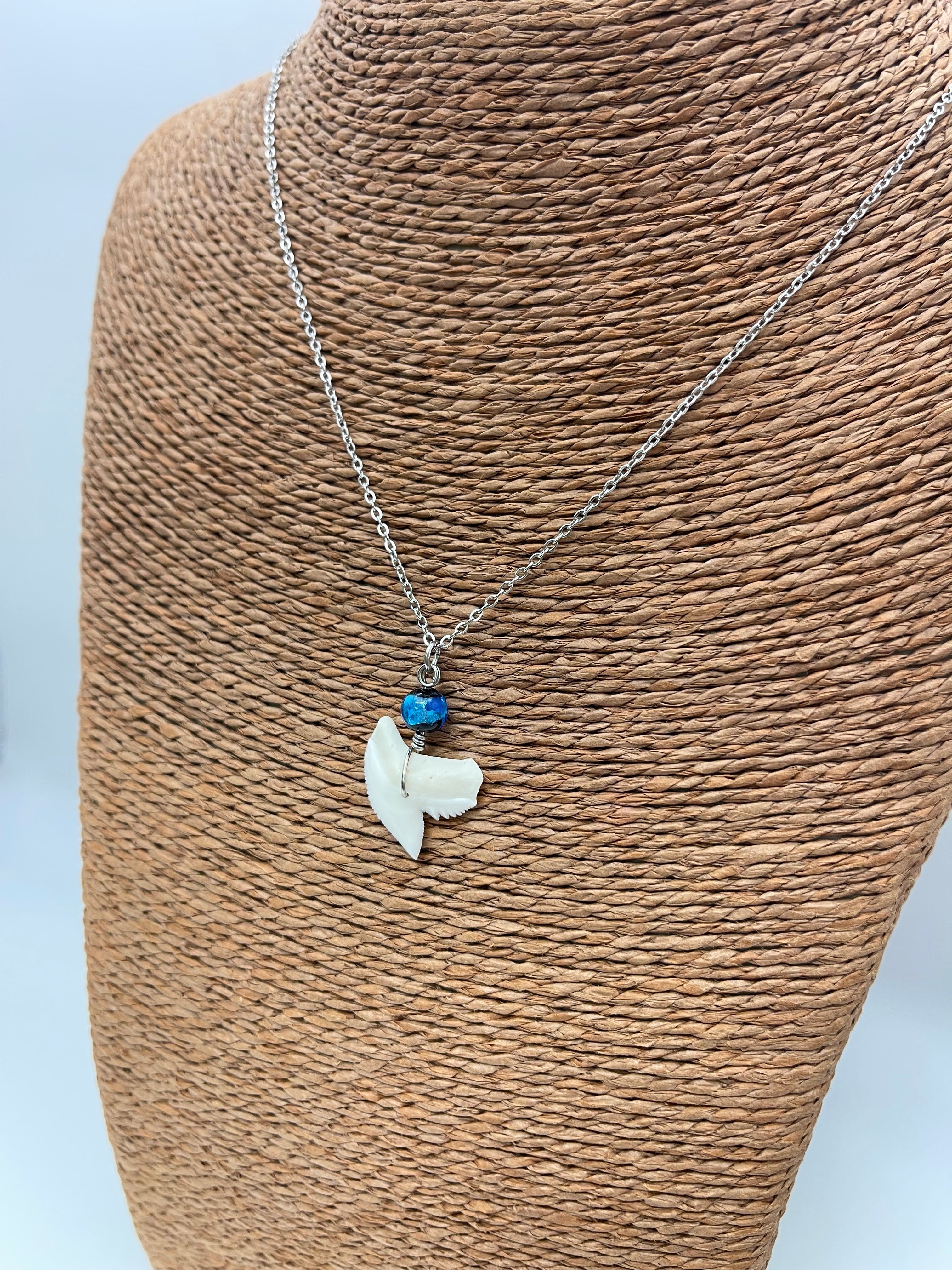 イタチザメの歯に沖縄のホタルガラスを組み合わせたオリジナルデザインのネックレス♪